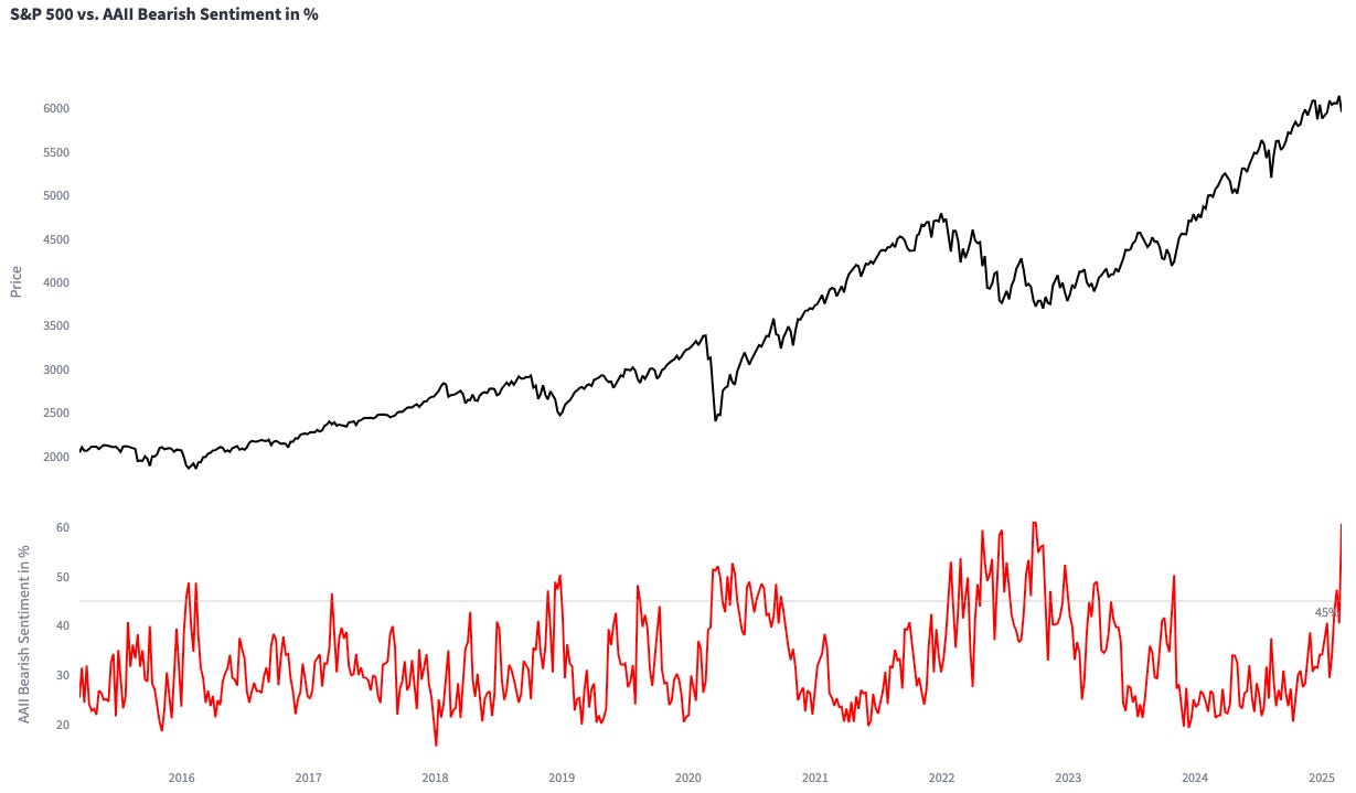 Retail investor sentiment hit a 1-year bearish high. According to the AAII retail investor sentiment survey, 60.8% of all retail investors are currently bearish on the stock market over the next six months. We typically see these kinds of readings when the stock market sold off >10% and we are near a bottom. Can the market sell off much more with this many investors bearish?