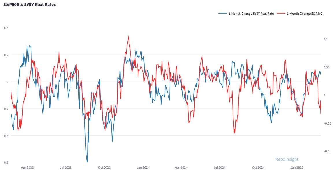 Enough about rates and FX. Let’s take a look at equities. In my opinion, the two main risks for equities are 1) high valuations and 2) elevated earnings expectations. If the economy slows down, earnings could disappoint, which would then make valuations look even higher. The S&P500 selloff last week was not caused by higher real yields. In fact, real yields dropped because they priced in slower economic growth in the future (see chart below).