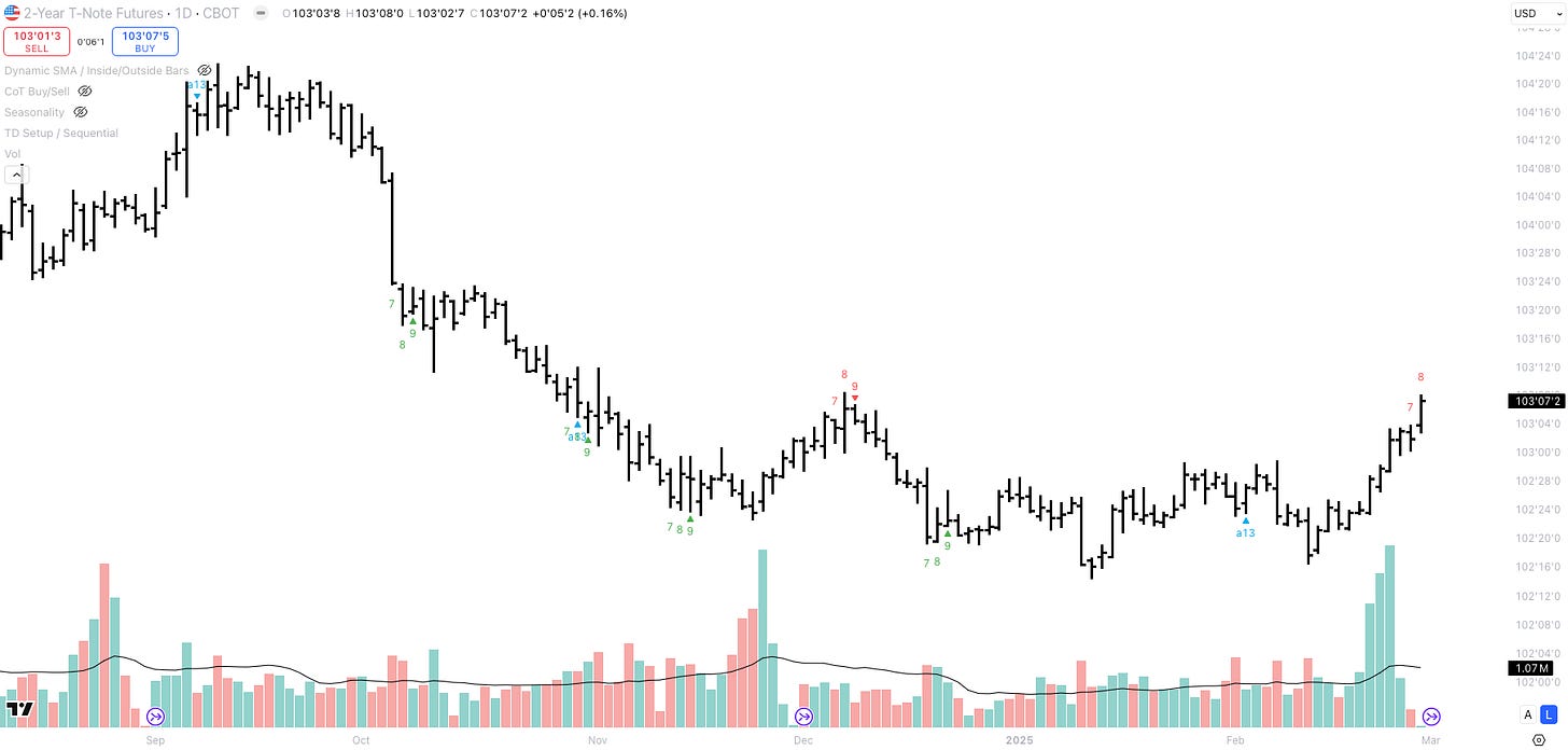 What a week for financial markets! My bullish view on the short end paid off. The threat of tariffs, shrinking fiscal deficits, and tighter immigration policies are all headwinds for economic growth. With inflation showing no signs of re-accelerating and the economy losing momentum, the Federal Reserve may cut rates more than once in 2025. Two-year yields dropped sharply, rallying from 4.39% to 3.99% in the last three weeks —a 40-basis-point move! The chart below shows the U.S. 2-year future. Don’t be misled by the elevated volume; it reflects investors rolling their March futures positions into the June future.