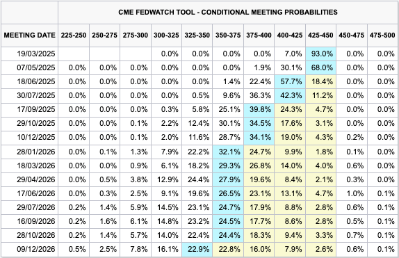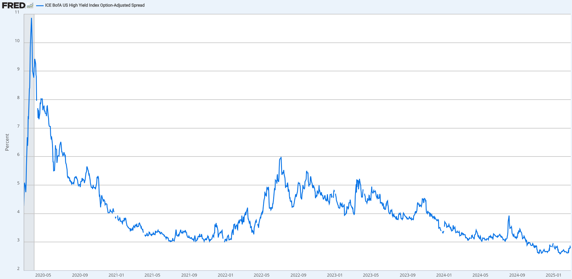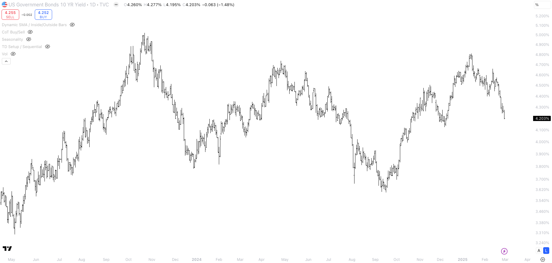 Next week’s NFP prints will be interesting. Elon Musk’s goal is to cut $4 billion in daily spending until September. To achieve this goal, DOGE plans to lay off 300-400k federal workers plus 600-800k contractors. With monthly NFP gains of 150,000–160,000, the unemployment rate would remain stable. However, government layoffs introduce a major risk to NFPs and more broadly economic growth. While the bond market is already pricing in an economic slowdown, I believe there is still room for the momentum to continue and 10y yields to fall further (see chart below).