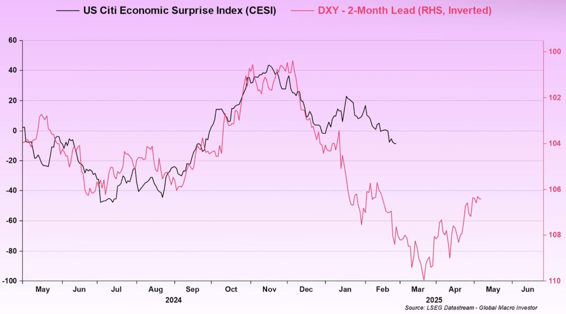 I believe the tightening of financial conditions since the Federal Reserve's 50bps rate cut in September—evidenced by the rise in US 10-year yields from 3.60% to 4.80% and the US Dollar Index climbing from 100 to 110—is finally impacting the real economy. Historical lead-lag relationships, such as the Citi Economic Surprise Index versus the US Dollar Index, support this view and suggest that economic data in the coming weeks may underwhelm expectations.
