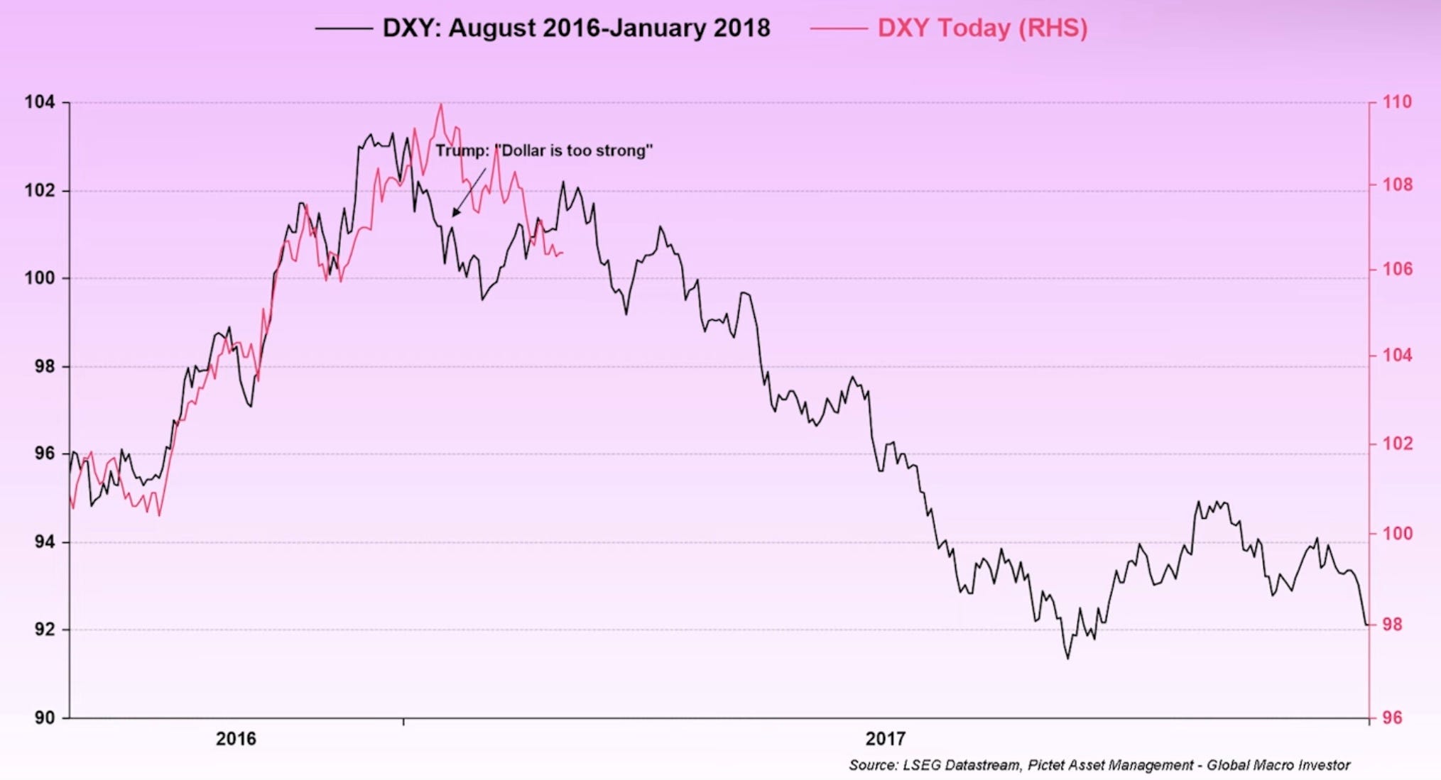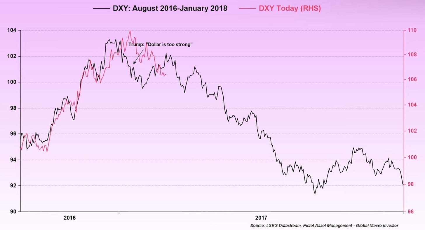 I interpret the strong US dollar as the market front-running the impact of tariffs, Trump's presidency, and US exceptionalism. Long USD was one of the most crowded macro trades a few weeks ago. However, if the 2016–2018 pattern repeats, the US dollar should weaken from here. The administration's push for lower 10-year yields supports this view. Narrower yield differentials could put pressure on the USD over the next 12 months.