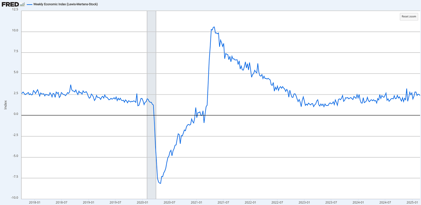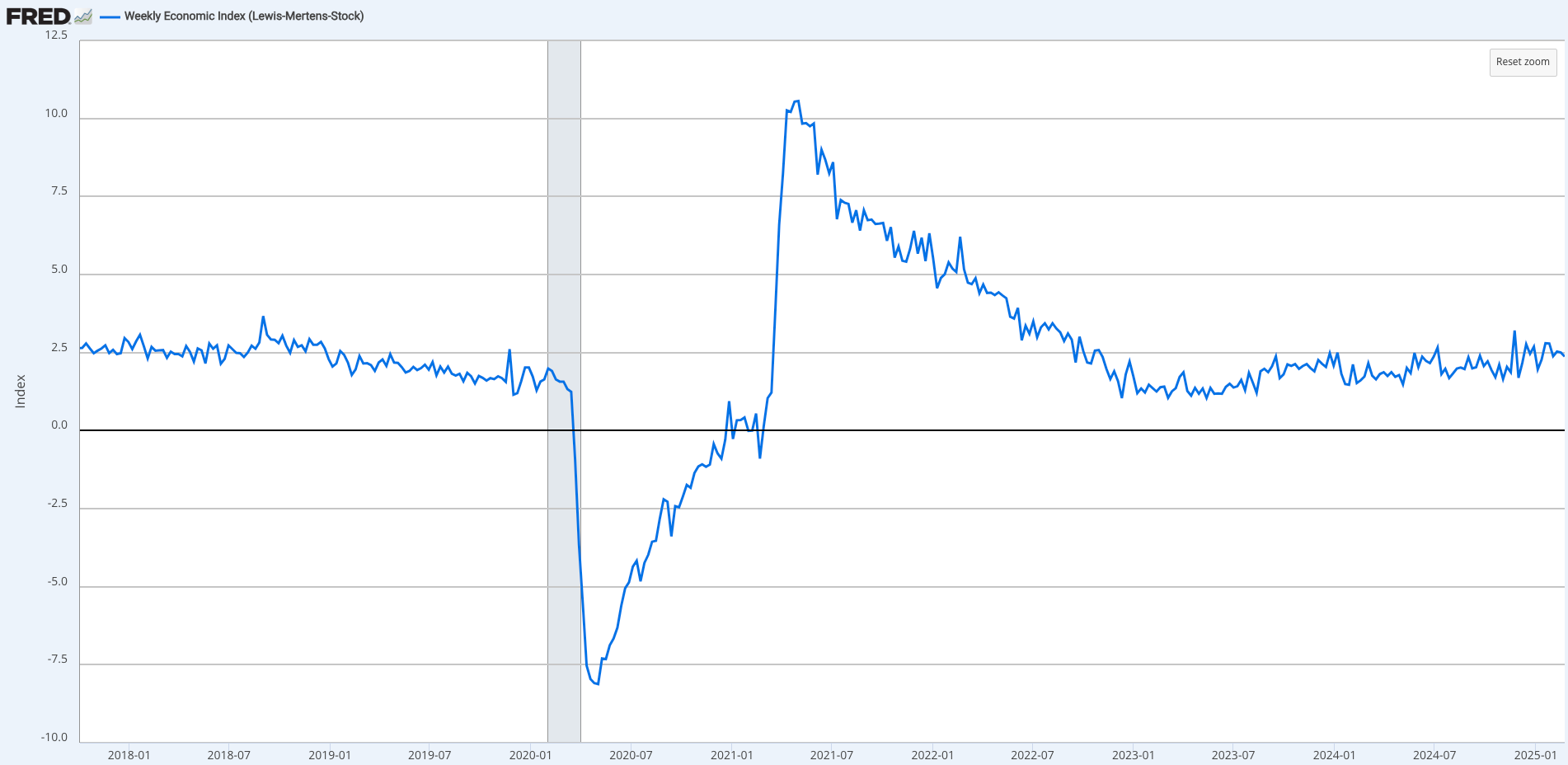Durable goods orders came in stronger this week, 3.1% m/m vs. 2.0% expected. Core PCE, the Fed’s favourite measure of inflation, printed in line with expectations at 2.6% y/y. The Weekly Economic Index does not reflect a slowdown yet (see chart below). Still, the short-end rallying and equities selling off last week suggests the market is pricing in weaker growth ahead.