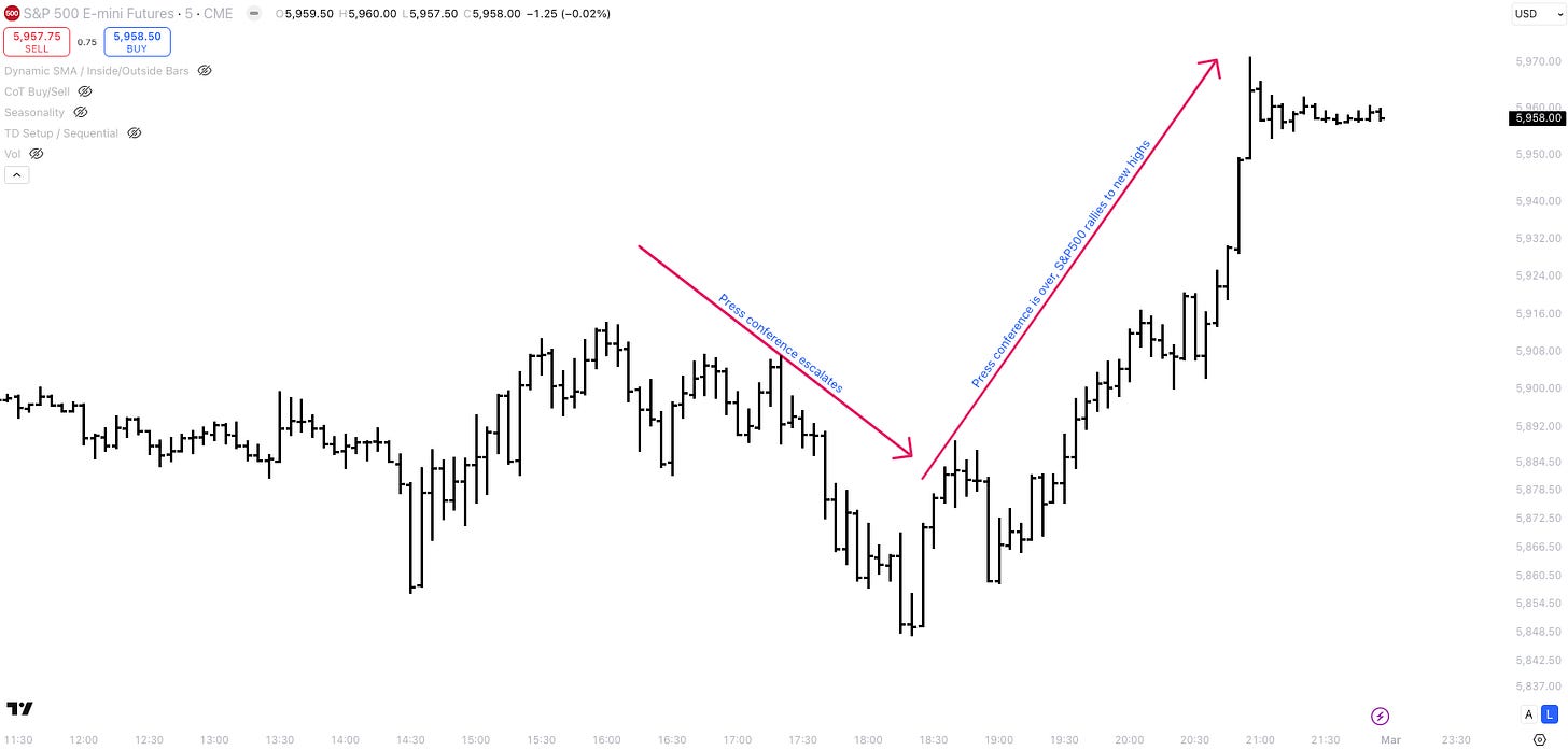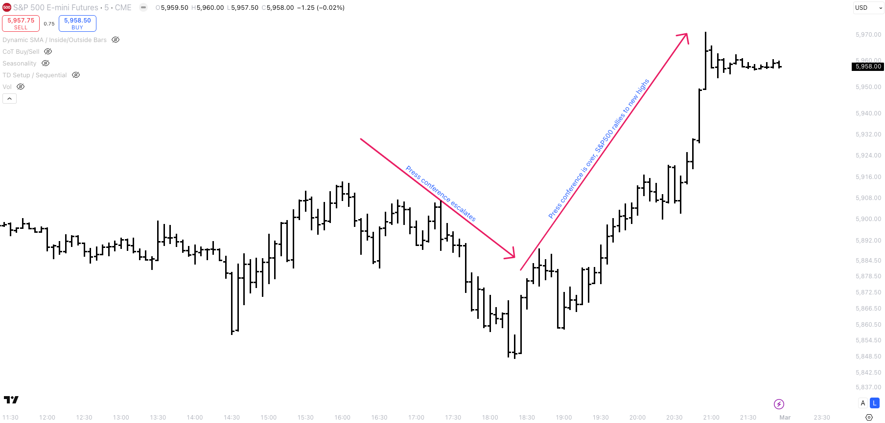 The S&P500’s price action on Friday was bullish. Initially, the S&P500 sold off because the press conference between Zelensky, Trump and Vance became more and more heated, but then it rebounded strongly and closed up +1.48%. The below 5min chart of the S&P500 shows the intraday price action.