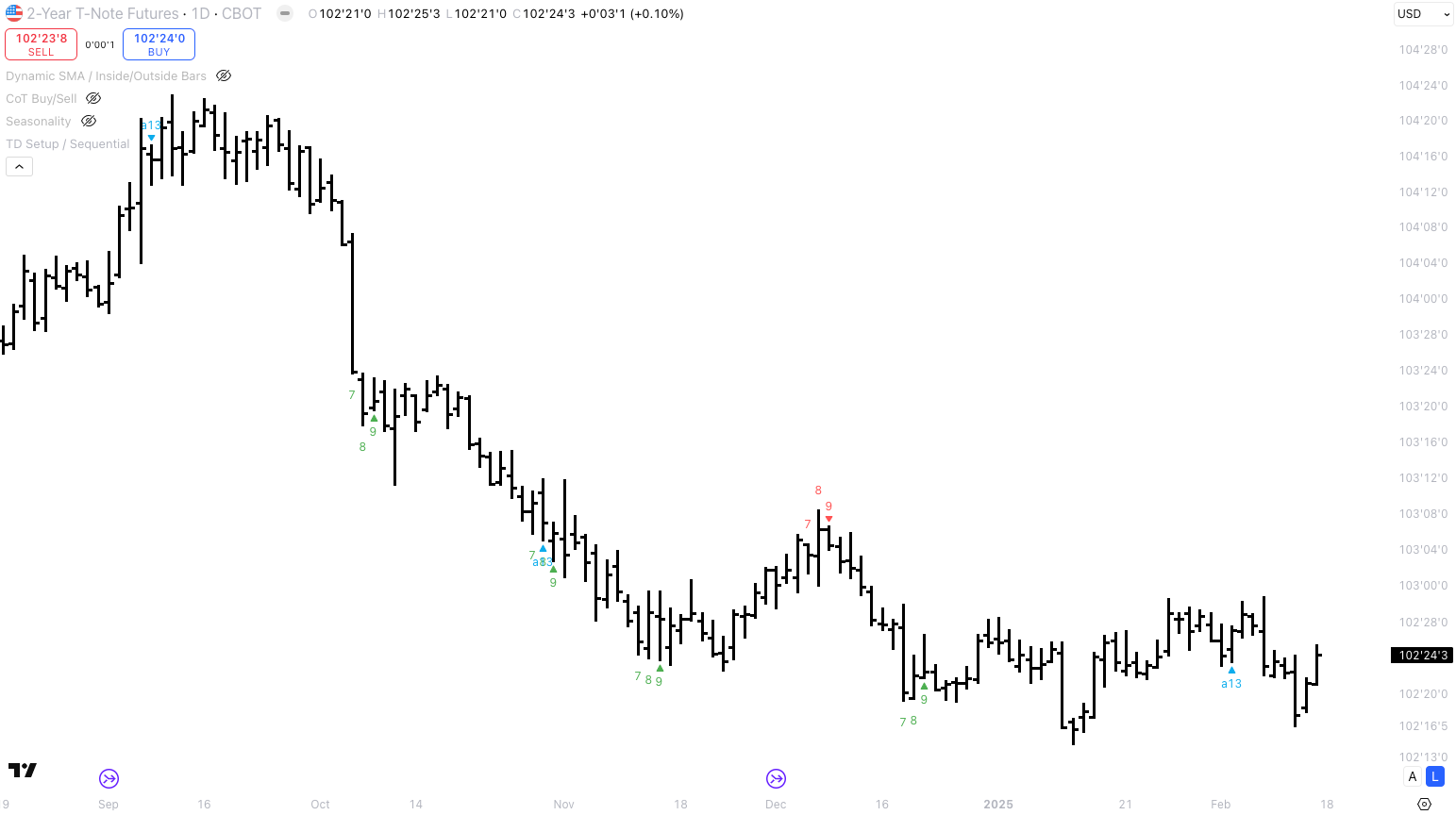 I am leaning bullish the short-end for a few weeks now. So far, it has been a chopfest with sideways action. The latest price action was bullish - the US 2y future is trading higher than where it was pre-CPI release. I think the risk/reward for a long US 2y future position is still favourable. If economic growth remains robust and inflation stabilises above 3%, the Federal Reserve likely does not cut rates this year. In that scenario, this trade loses money. However, if the economy slows down and shelter inflation decelerates, which then pushes core inflation closer to 2%, the bond market could price 50-75bps of cuts instead of 25bps in 2025.