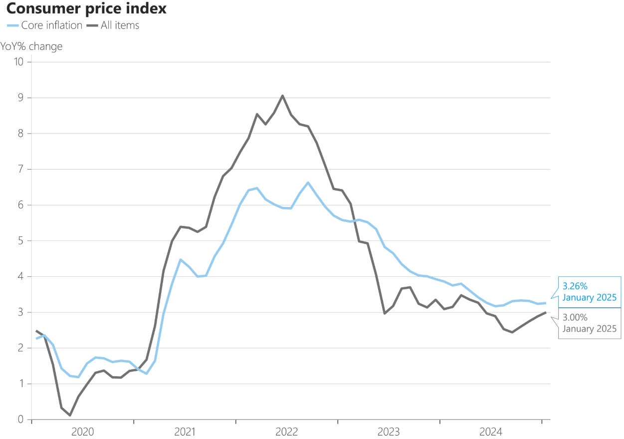 Last month’s December CPI print was heavily influenced by seasonal adjustments, making it less reliable. In contrast, this week’s CPI report was undeniably hot. Core CPI rose 3.3% year-over-year, exceeding the 3.1% forecast, while headline CPI surprised to the upside at 3.0% versus 2.9% expected. Supercore CPI surged 0.75% month-over-month, marking its highest reading since last January. While the overall trend in inflation remains downward, the path remains uneven.