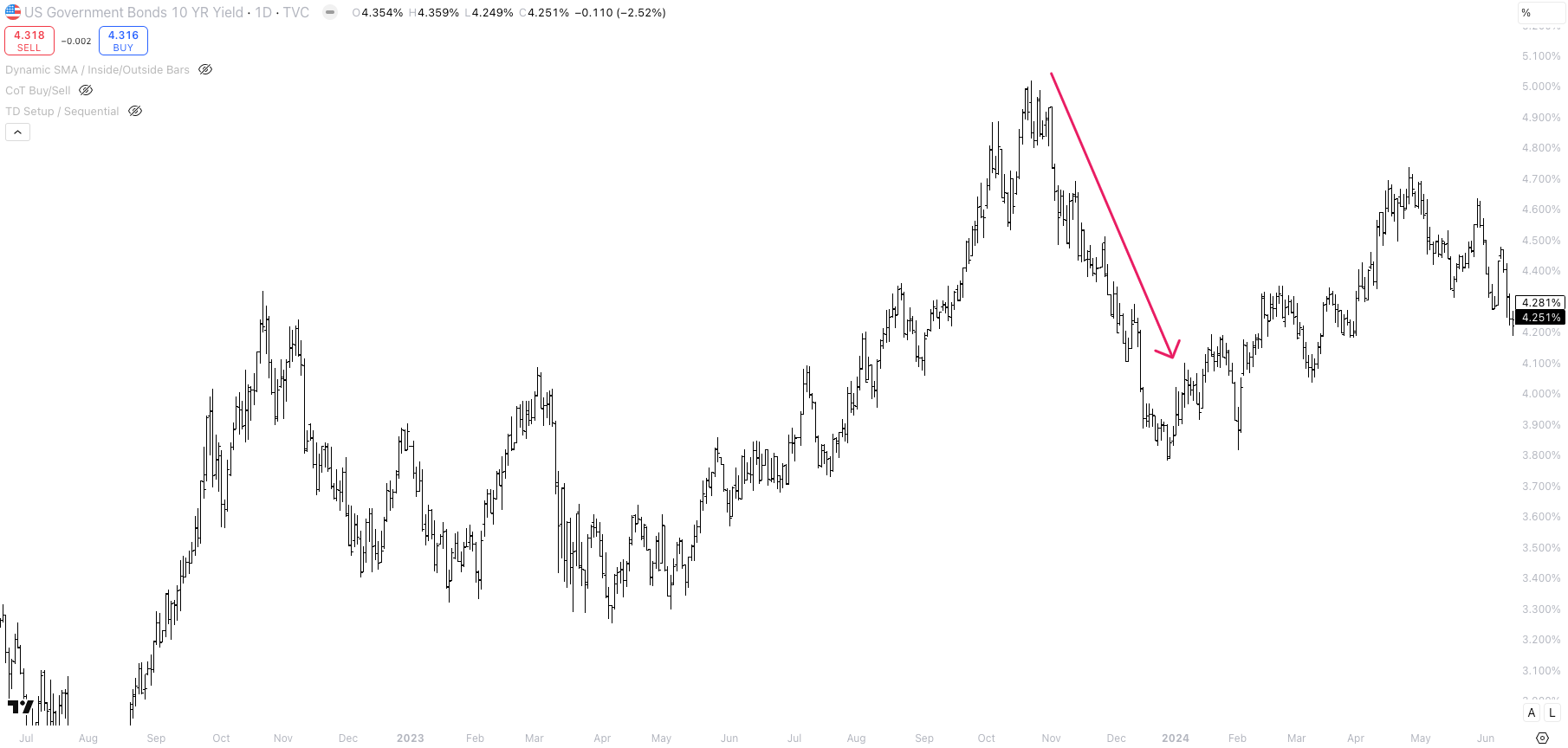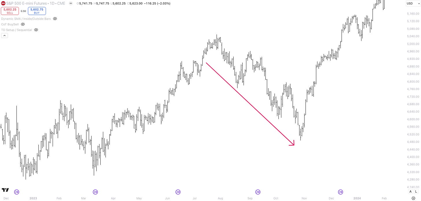 Then, a shift occurred. U.S. 10-year yields started to ease, and equities began to sense that a recession wasn’t in the cards. Between mid-October and the end of December 2023, the U.S. 10-year yield dropped from 5.02% to 3.78%. This retreat in yields marked a notable loosening of financial conditions, providing a tailwind for equity markets.