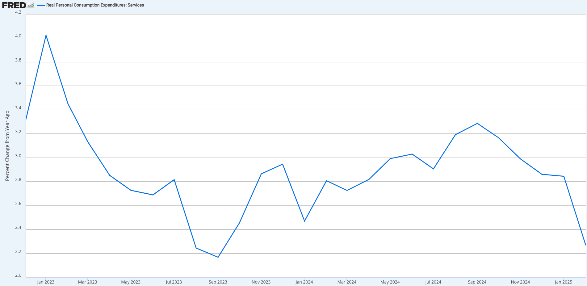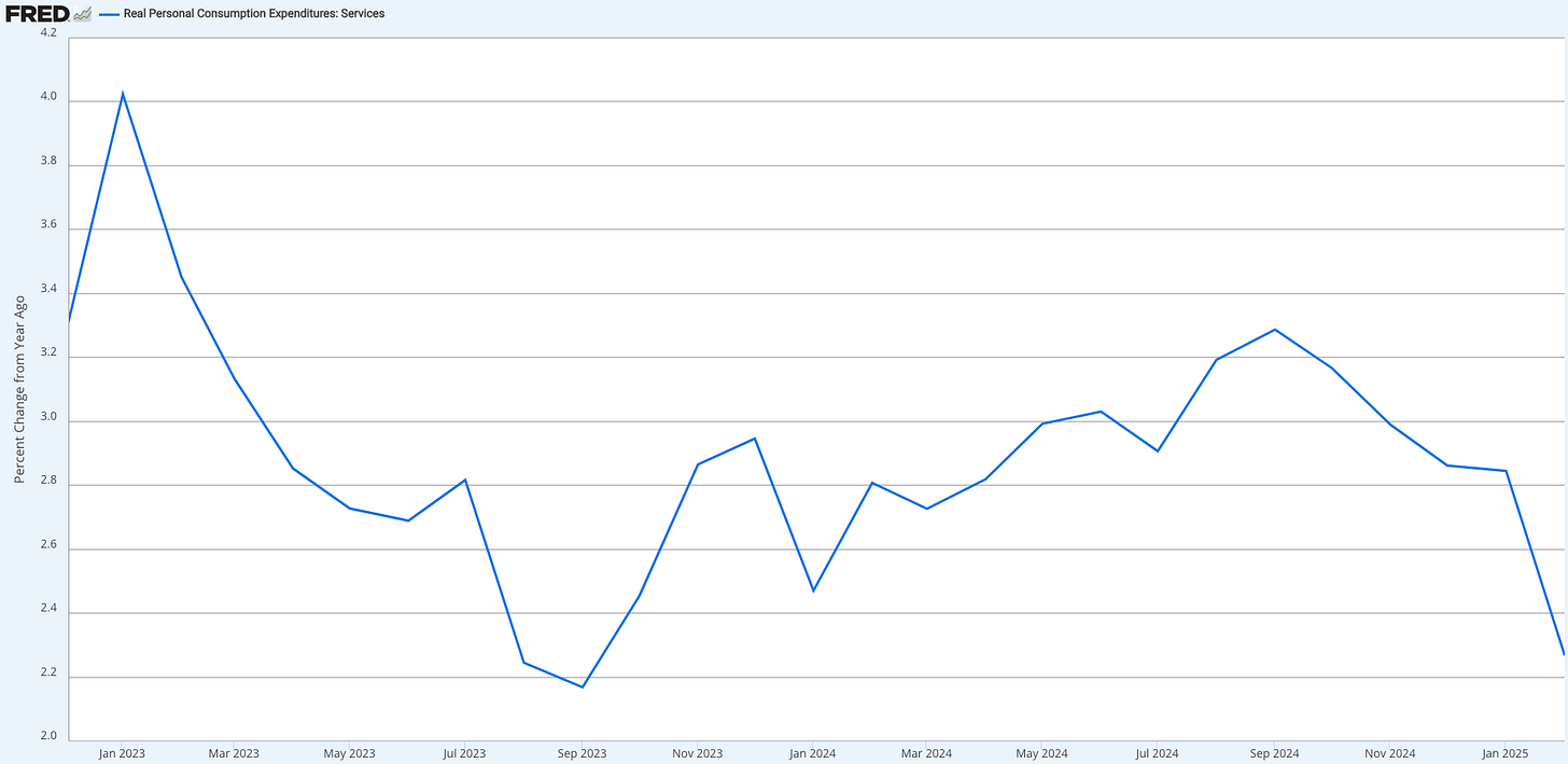 Friday’s personal income and spending data triggered another equity sell-off. Spending rose 0.4% (below the 0.5% expected), while income surprised to the upside at 0.8% (versus 0.4% anticipated). The market’s reaction likely stemmed from weaker services spending: real personal spending on services grew at just 2.27% year-over-year—the softest reading since August 2023 (2.24%) and September 2023 (2.17%).
