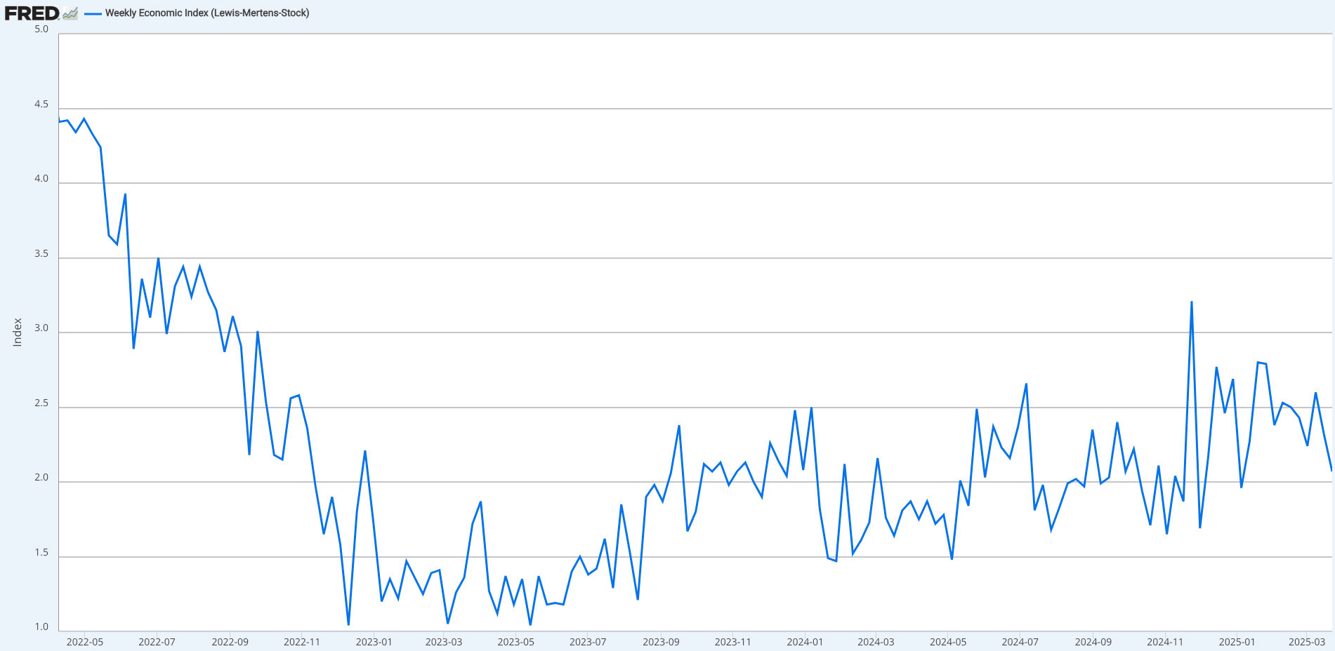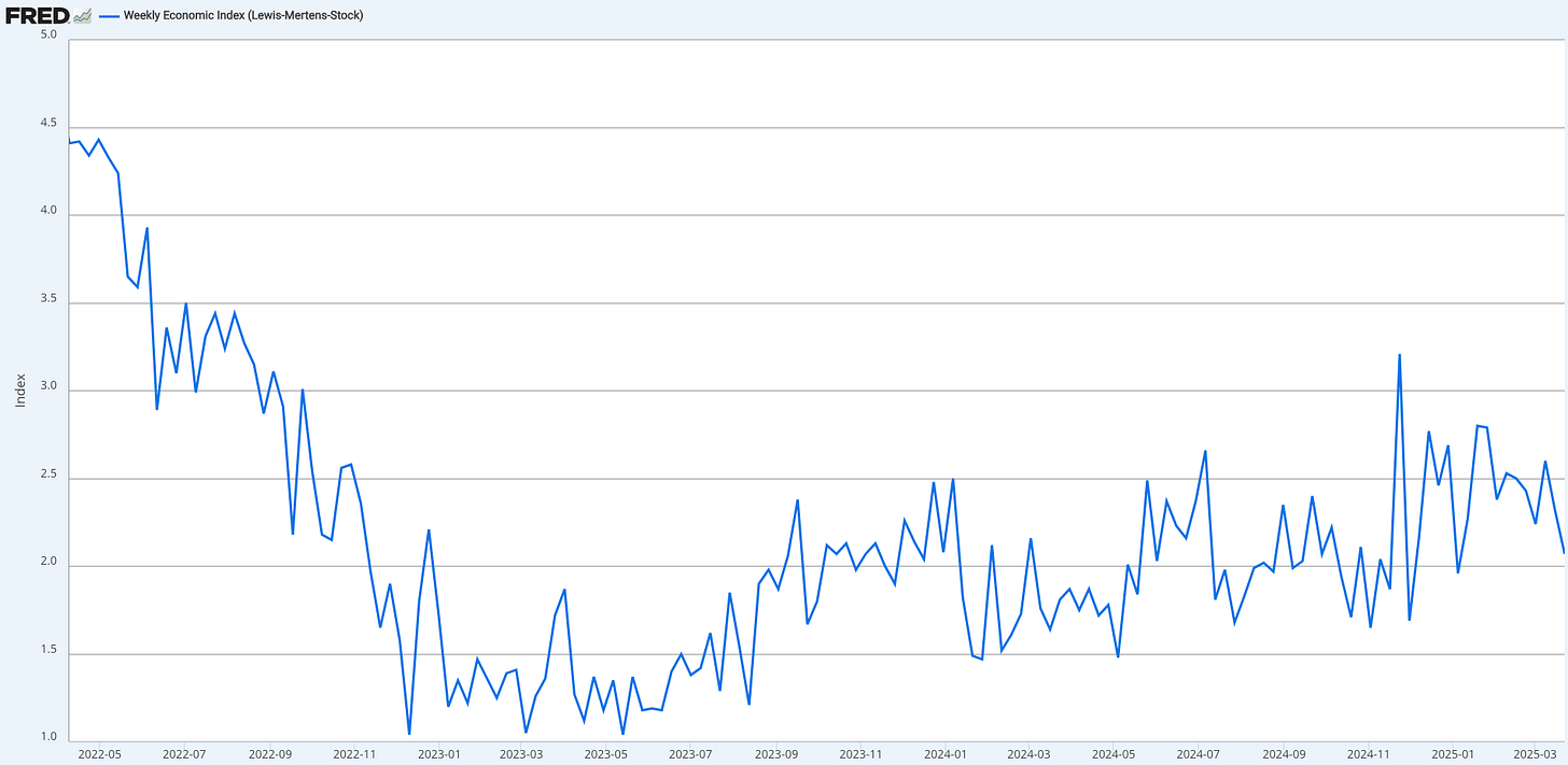 Equity valuations are stretched, earnings expectations are lofty, and tariff threats are injecting uncertainty into the minds of business leaders. From the outside, this mix looks grim and leads to investors dialling back risk. Yet, the hard data isn’t as dire as the market seems to believe. The NY Fed GDP Nowcast projects 2.8% growth for Q1 2025 and 2.6% for Q2 2025. The Weekly Economic Index hasn’t shown any meaningful slowdown either.