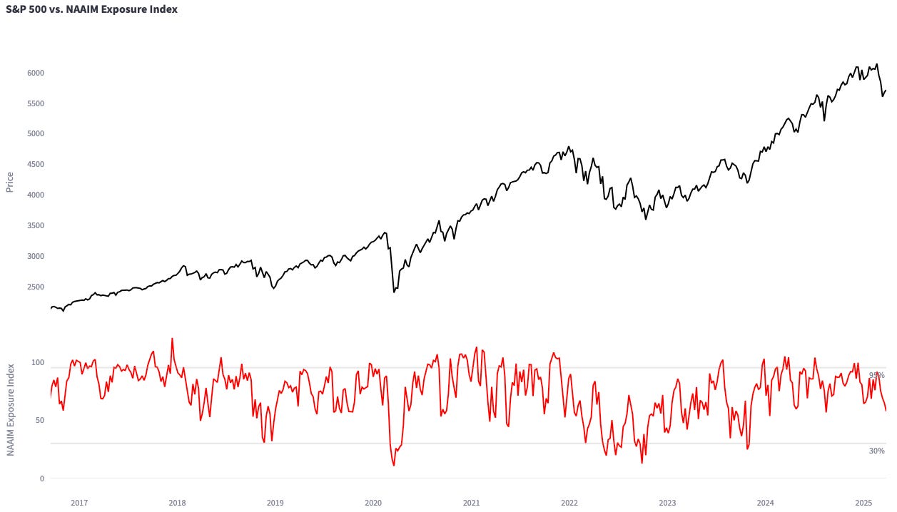 While sentiment has hit extremes, positioning tells a slightly different story—it’s not as bearish as one might expect. Household exposure to U.S. equity markets remains substantial, with allocations sitting at record-highs. Shorter-term indicators, like the NAAIM Exposure Index, have yet to signal a full capitulation: