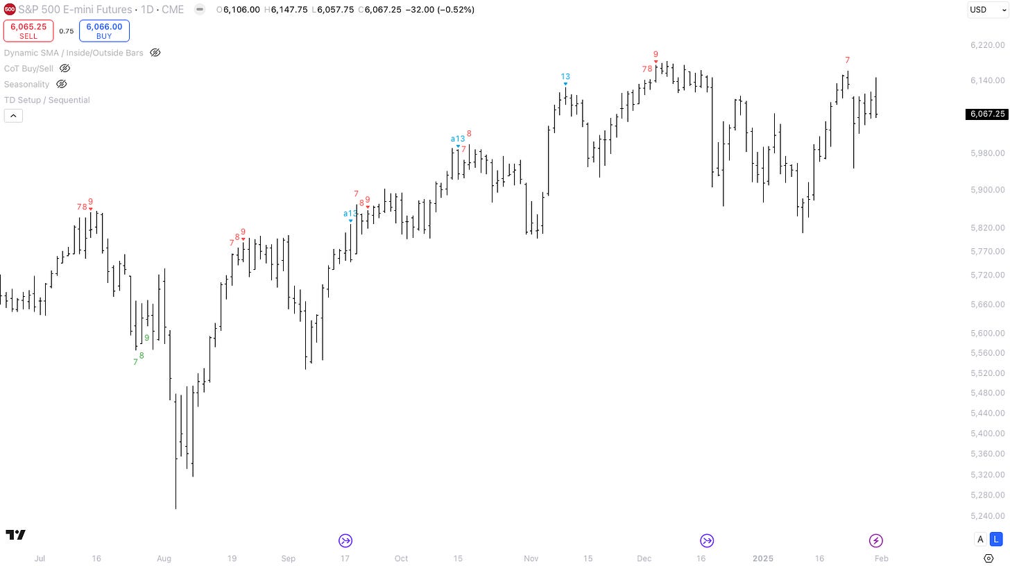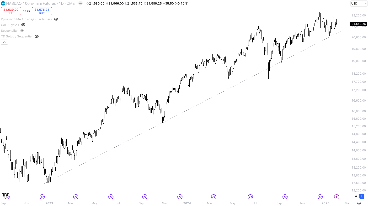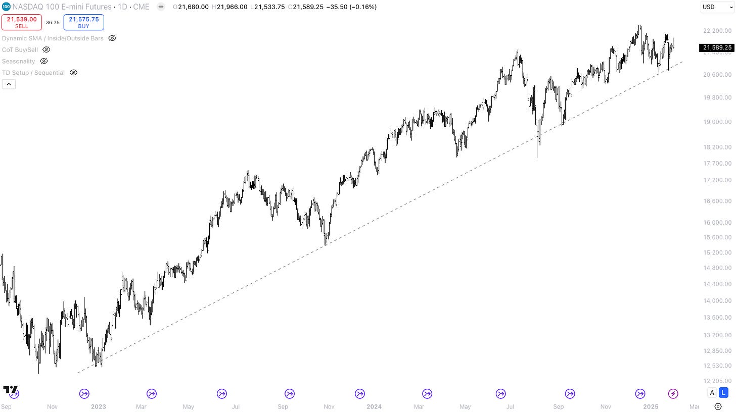The chart below shows the Nasdaq-100. Friday’s reversal, triggered by the White House’s press release announcing that tariffs will be unveiled on February 1st, gives us an indication of what we might expect on Monday.