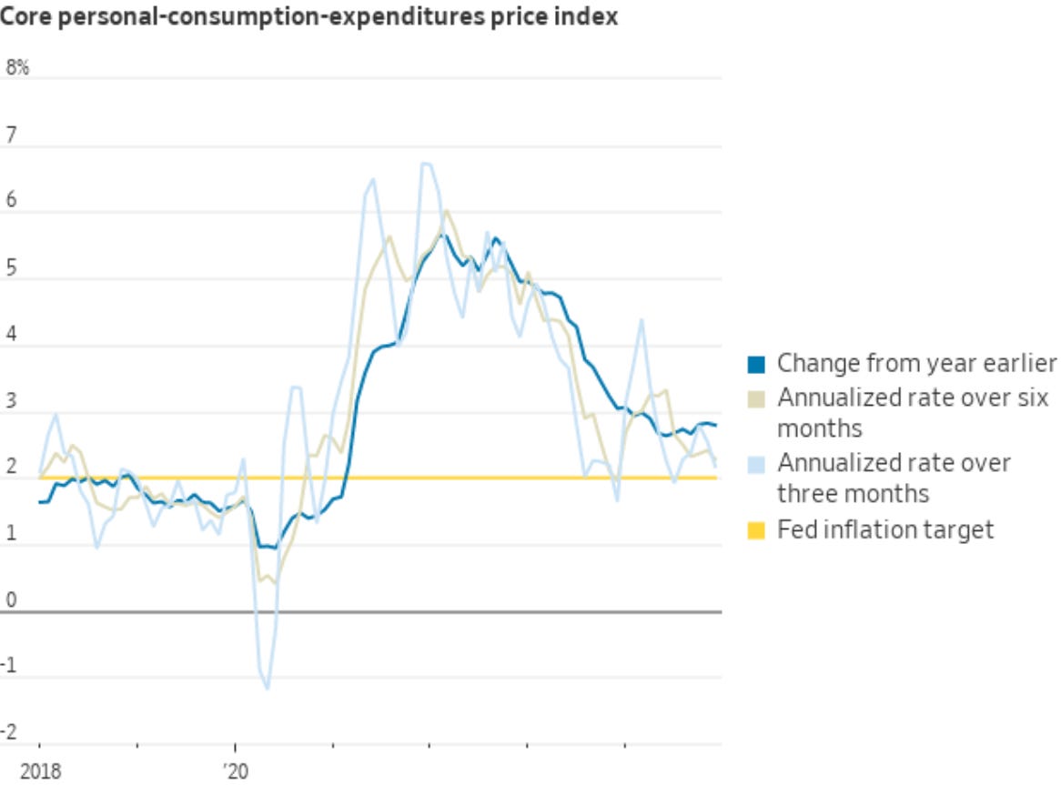 Friday’s core PCE came in slightly lower than expected. Both, 3-month and 6-month annualised core PCE are now running lower than the 12-month measure. 6-month annualised core PCE is at 2.3% and 3-month annualised core PCE came in at 2.2%.