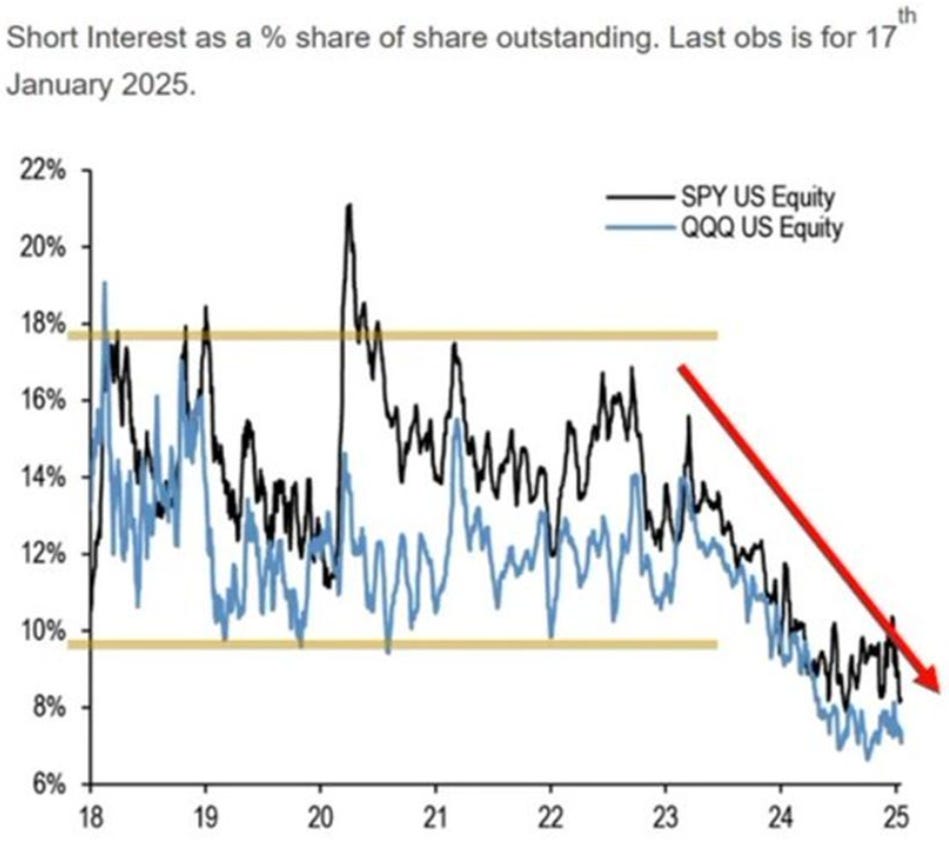 Short interest is low in the Nasdaq-100 and S&P500, as pointed out by Bob Elliott on X.
