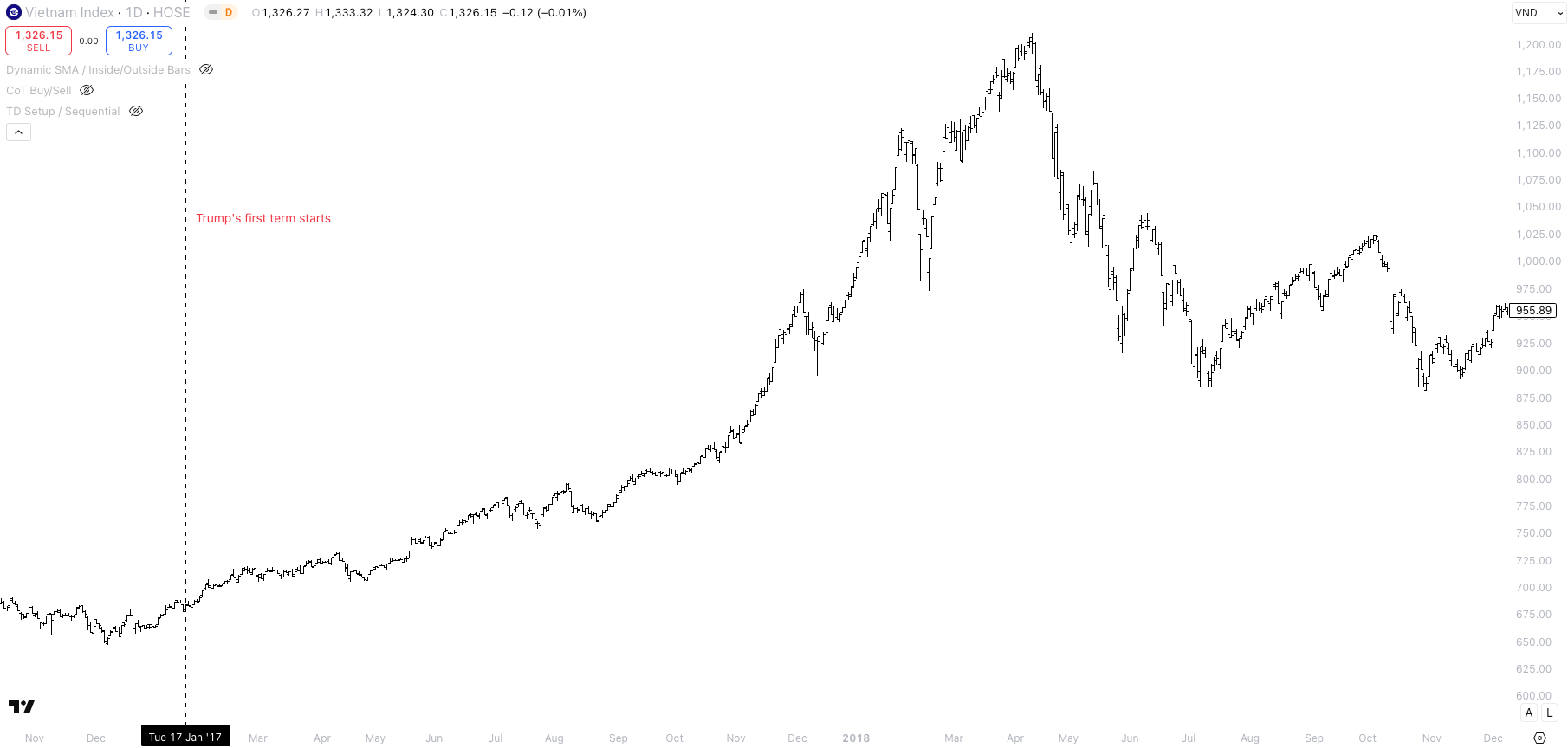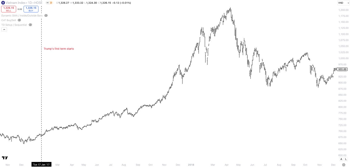 After Trump’s first term started in January 2017, Vietnamese equities rallied more than 60% in 12 months. A lot of foreign direct investment was re-directed from China to Vietnam.