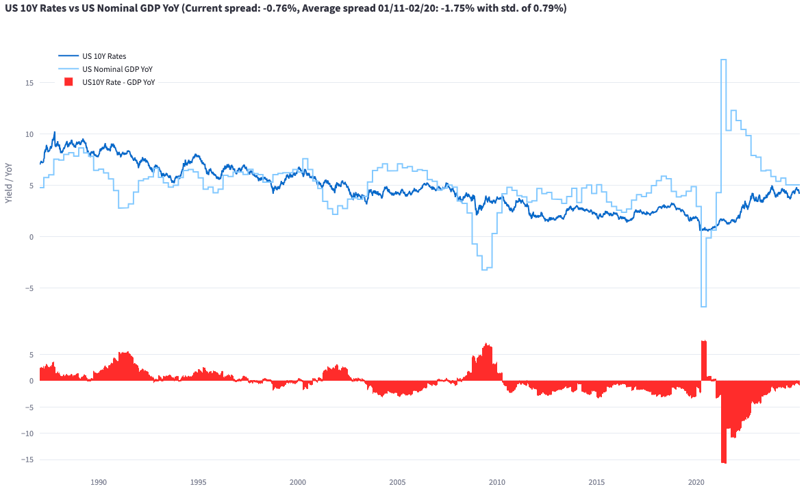 At the moment, my base case is that inflation will continue to slow towards the 2% target. If US nominal GDP growth slows to 3-4% and inflation slows to 2%, the historical spread of GDP growth to 10y yield suggests a lower 10y yield. From January 2011 to February 2020, the average 10y yield minus GDP growth spread was -1.75%.