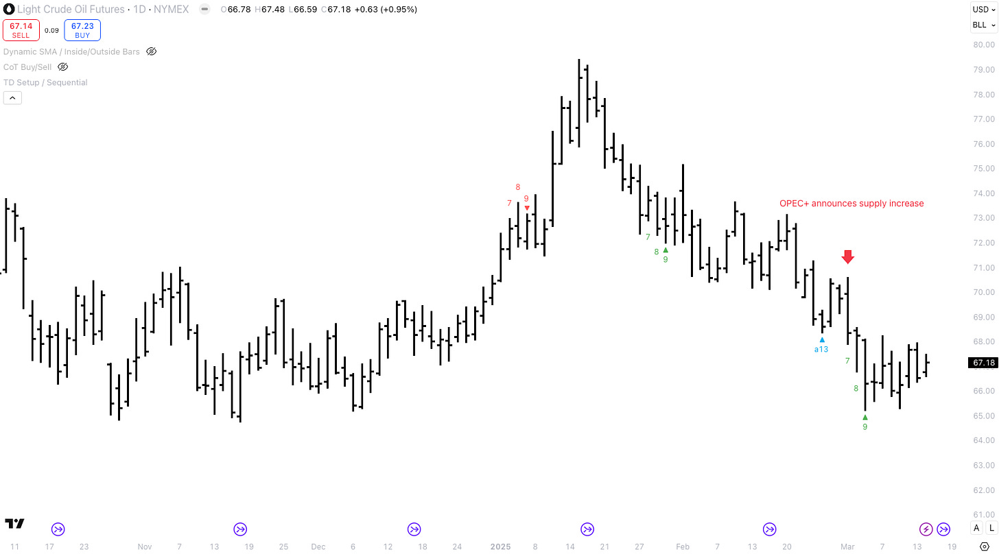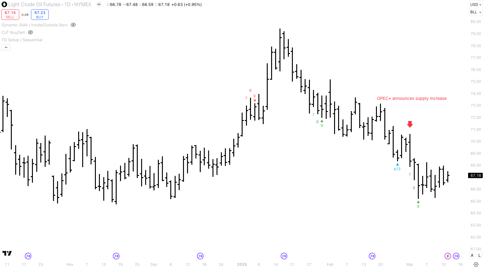 There are two major bearish developments right now. OPEC+ is going to raise the oil output by 138,000 bpd in April, marking the first increase since 2022, and the Trump administration is targeting lower oil prices. I am looking for bearish news, but the oil price shaking it off and closing up on the day.
