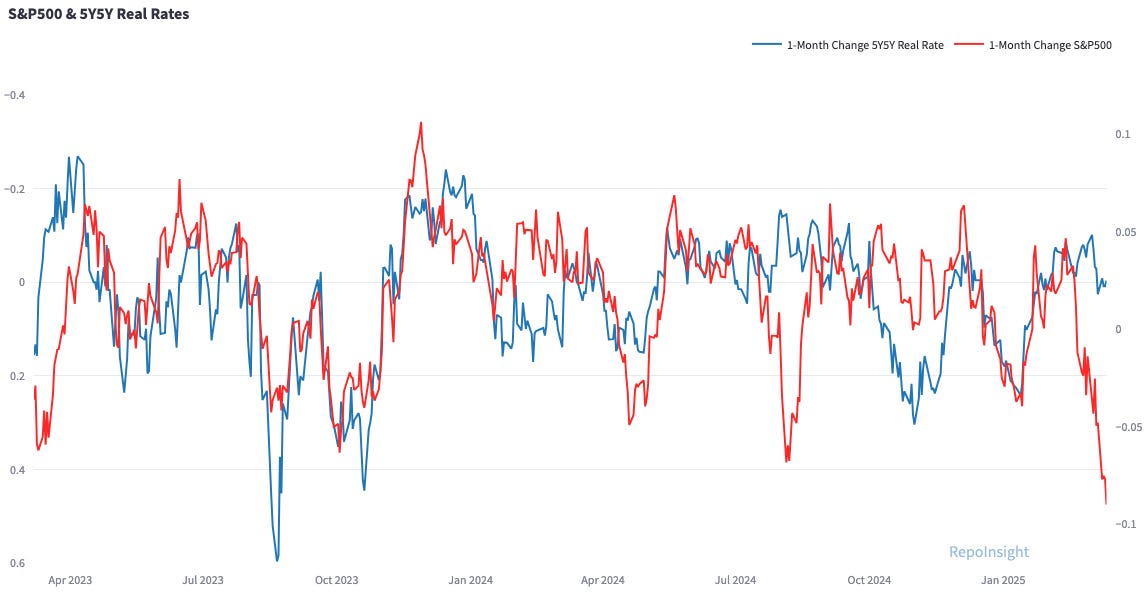 The move in equities is not supported by the bond market. Of course, if the bond market is pricing in a recession and a decline in earnings, this is negative for equities. But if a recession is not your base case, lower real rates allow for higher equity valuations.
