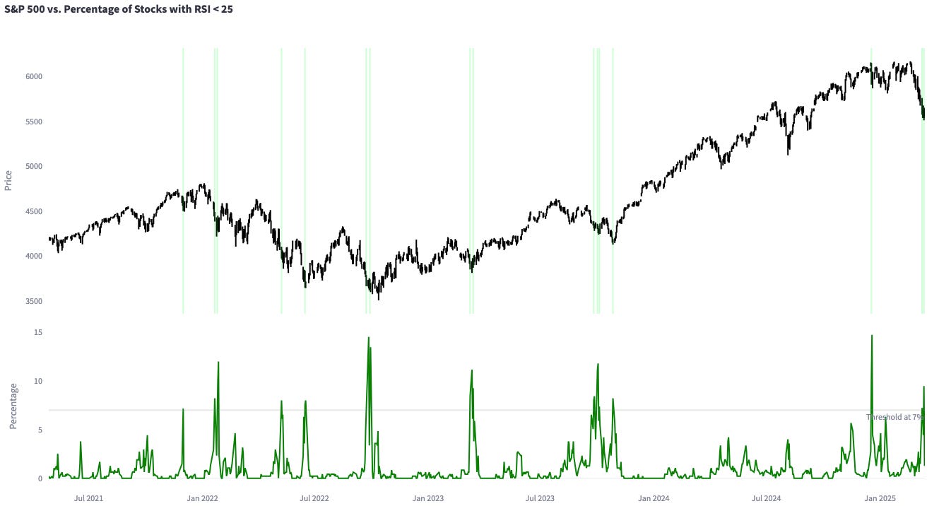 BUT, everyone knows this. If you trade tactically, it could be the time to play for a bounce. S&P500 stocks with RSI < 25 spiked at the end of the week.