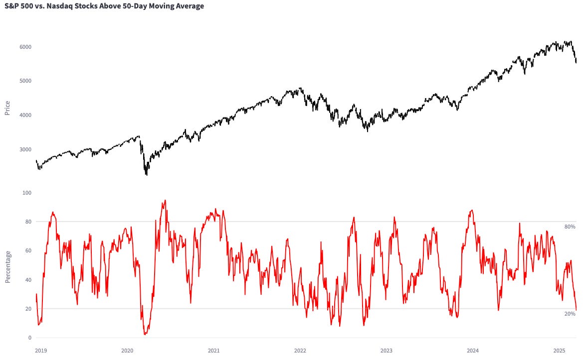 S&P500 stocks below their 50-day moving average are at similar extremes. That does not mean we cannot get even more oversold, it simply means the risk-to-reward to be short is not great anymore.