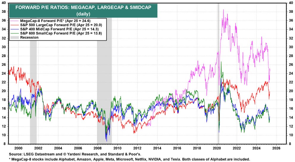 Let’s take a look at equity valuations and earnings expectations. Valuations have come down: the S&P 500 forward P/E is now at 20x, and the Magnificent Seven’s forward P/E has fallen to levels last seen during the COVID pandemic.