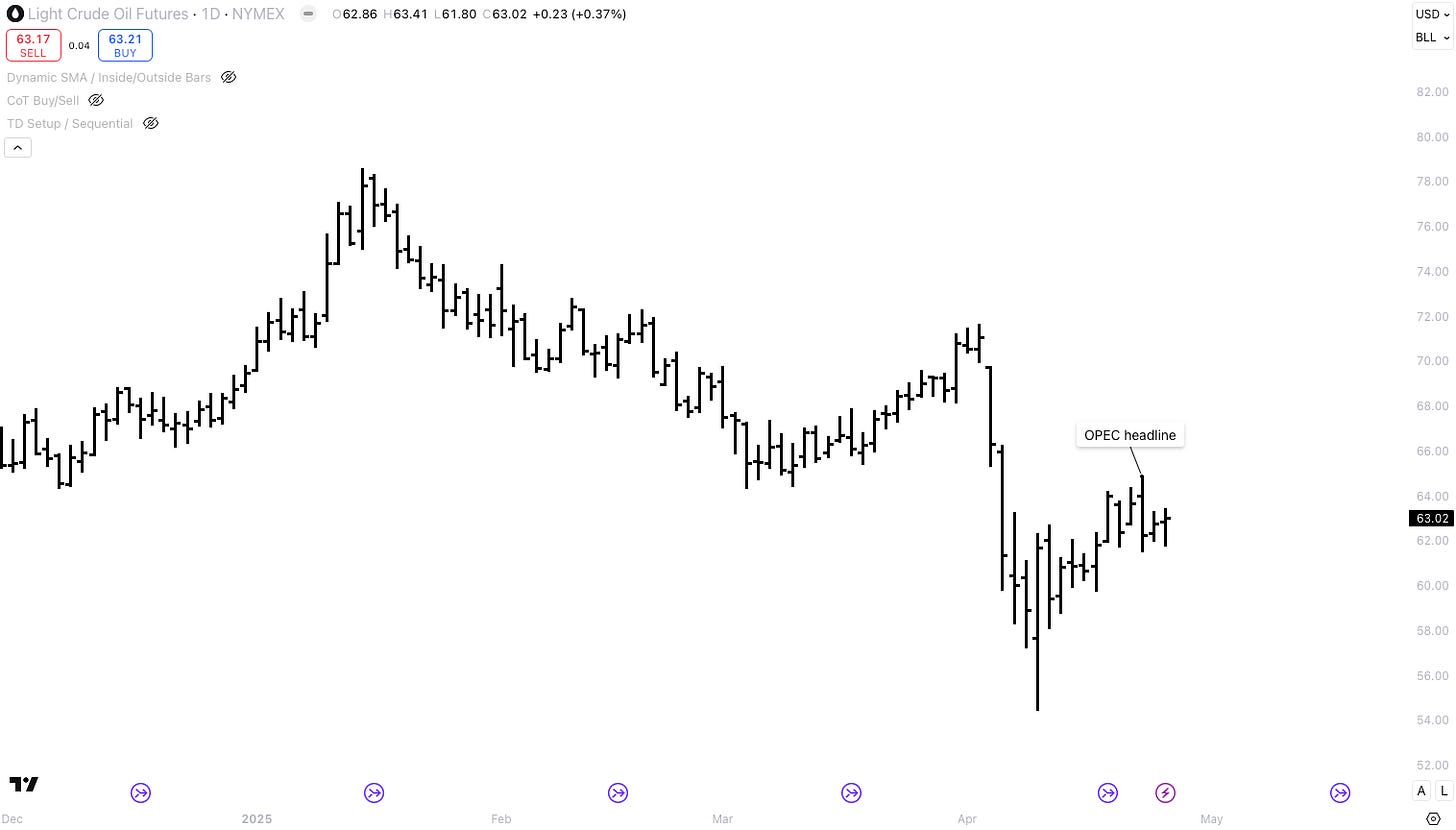 Positioning in crude oil is currently crowded short, and it may be starting to unwind. However, bearish forces still exist that could push oil prices lower. On Wednesday, April 23rd, the headline broke that "several OPEC+ members want the group to approve another accelerated oil output increase for June during their May 5th meeting."