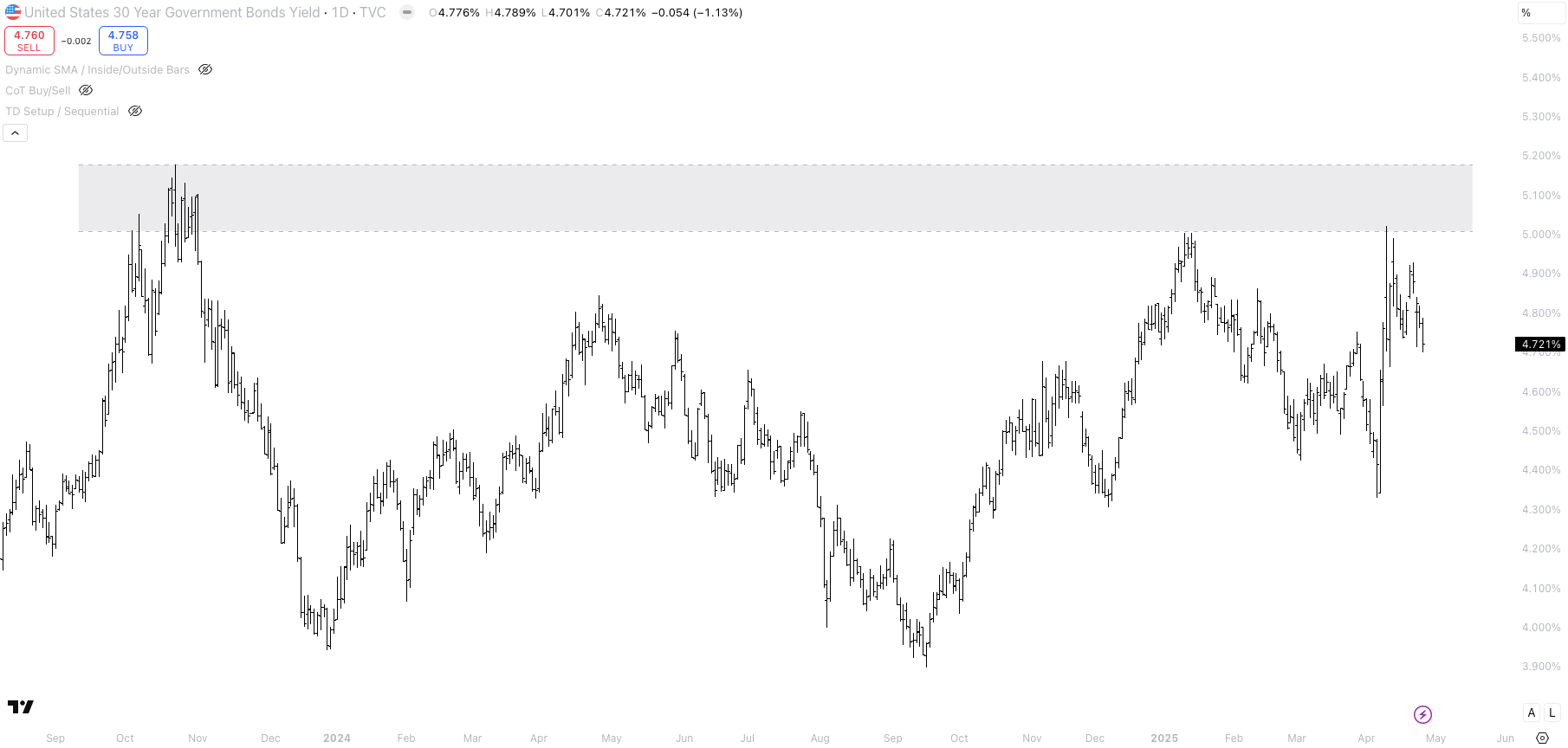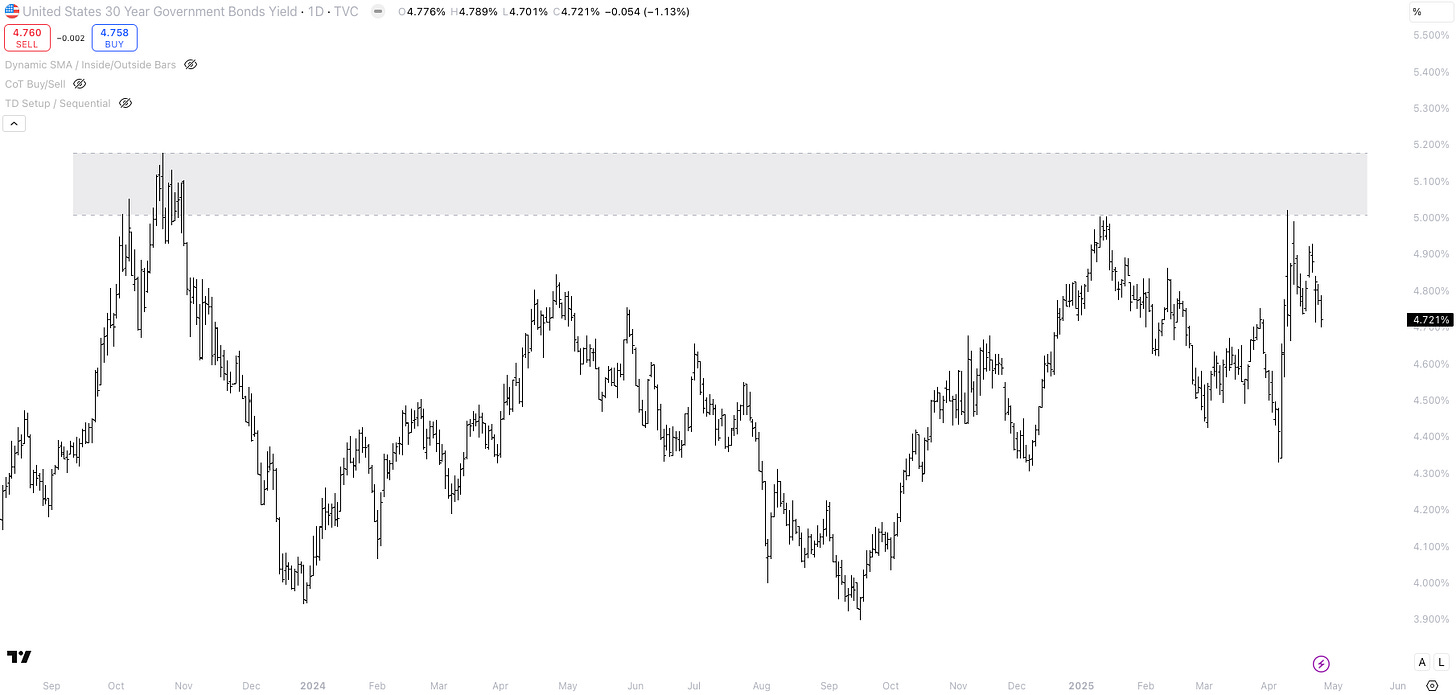 Last week, I highlighted the 5.00%–5.20% range as the danger zone. The key question is whether pension funds, insurers, and asset managers will step in and buy 30-year U.S. bonds yielding 5%. On Wednesday, U.S. 30-year yields actually closed higher after Trump stated he had no intention of firing Powell. Initially, I viewed this as poor price action.