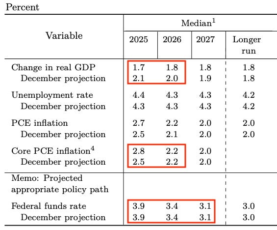 On Wednesday, the Federal Reserve updated its Summary of Economic Projections (SEP). The board expects 1) weaker GDP growth of 1.7% in 2025 and 1.8% in 2026, 2) higher core PCE inflation of 2.8% in 2025, and 3) two rate cuts in 2025 (unchanged).