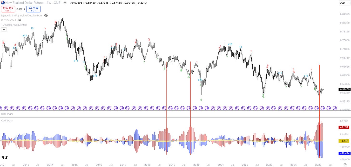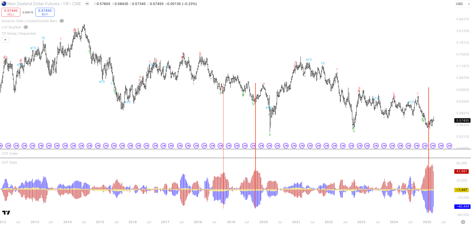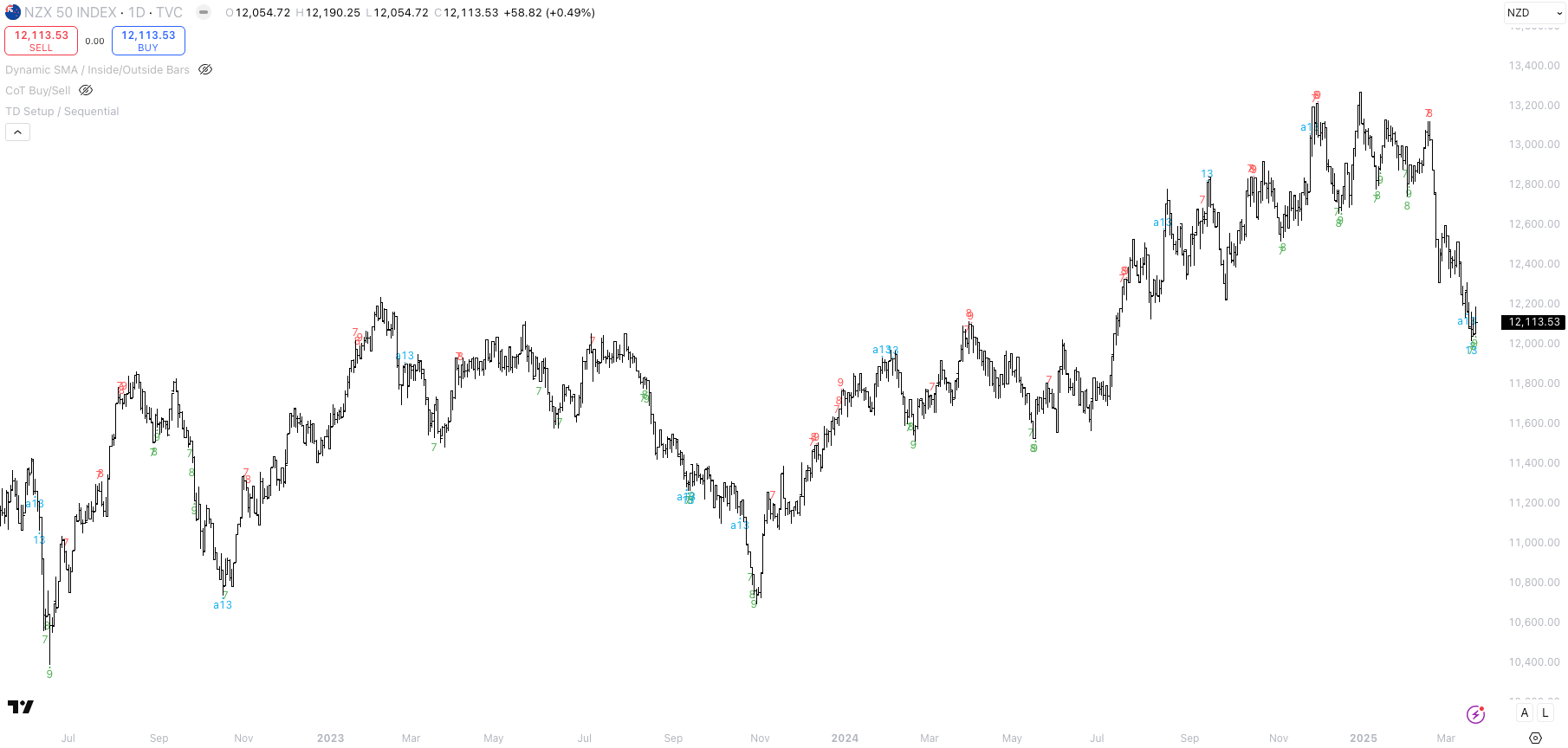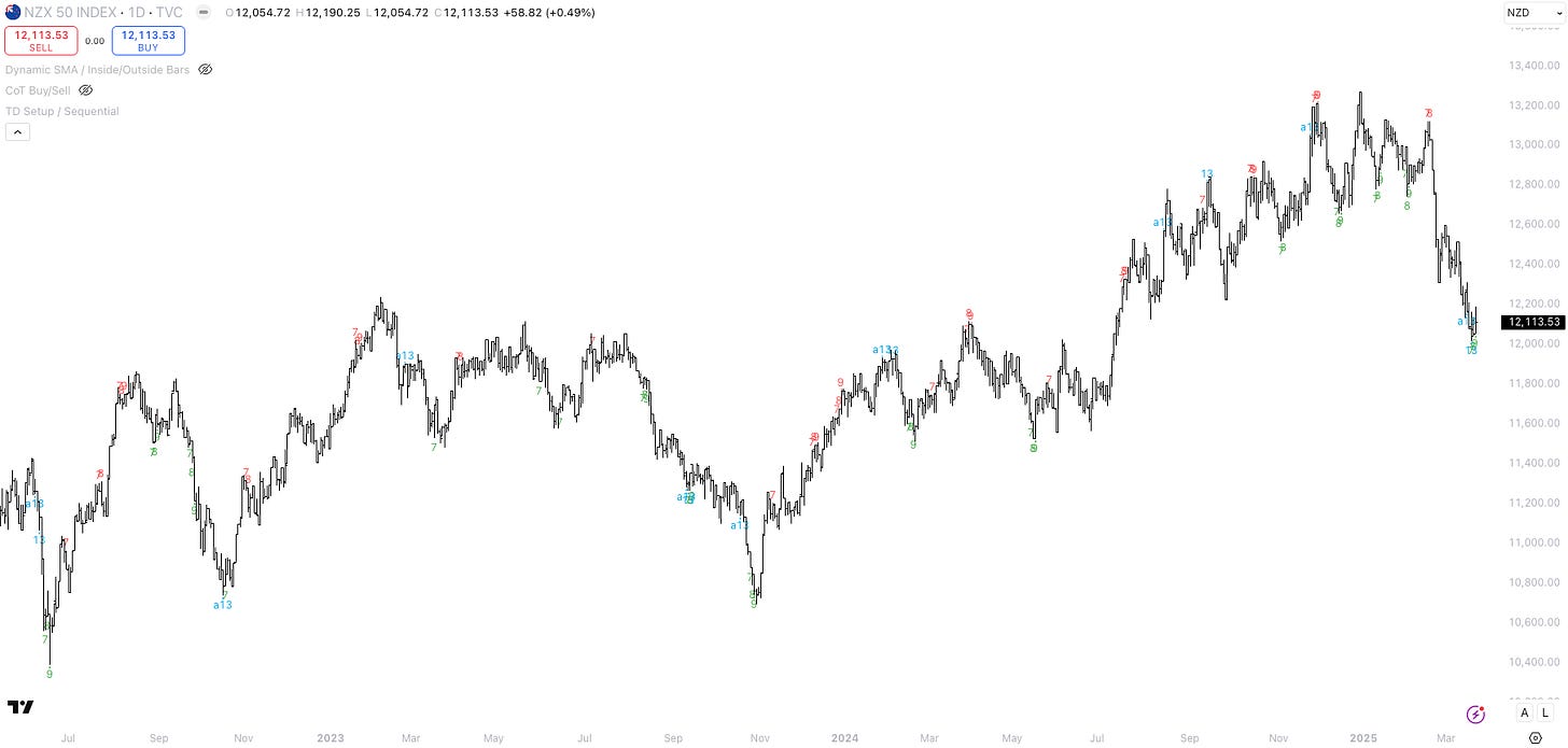 Idea 1 - Long NZD: New Zealand's economy is doing poorly. GDP contracted by 1.1% in the June 2024 quarter and by 1.0% in the September 2024 quarter. The latest GDP print on Wednesday came in above expectations, 0.7% QoQ vs. 0.4% expected. The stock market has done poorly in the past two months. However, TD13 and TD9 buy signals were triggered last week.