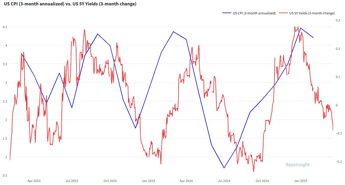 The below chart compares US CPI 3-month annualised to the 3-month change in US 5y yields. It shows that inflation has to come in lower in the next few months for US yields to continue to fall.