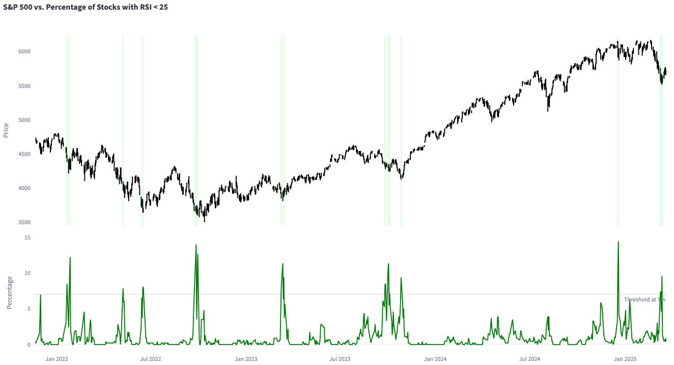 Last week, I wrote that if equities avoid a deeper bear market (decline of more than 20%), then this is likely a buying opportunity. Seasonality and sentiment remain supportive, and there are signs of an oversold market. Below is an updated chart showing the percentage of S&P500 stocks with RSIs below 25.