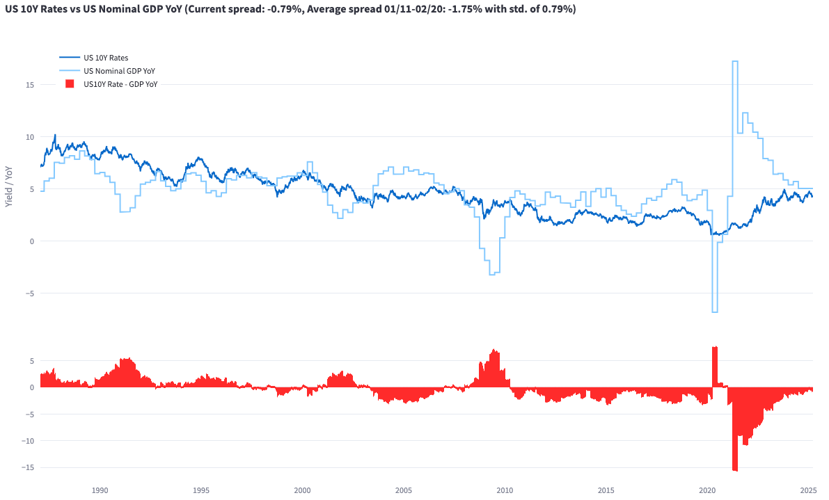 At the moment, I find it difficult to make a great bull or bear case for US rates. If growth slows significantly, let’s say nominal GDP growth falls to 3-4% and inflation converges towards 2%, US 10y yields should be lower. Take a look at the chart below, which compares nominal GDP growth to US 10y yields.