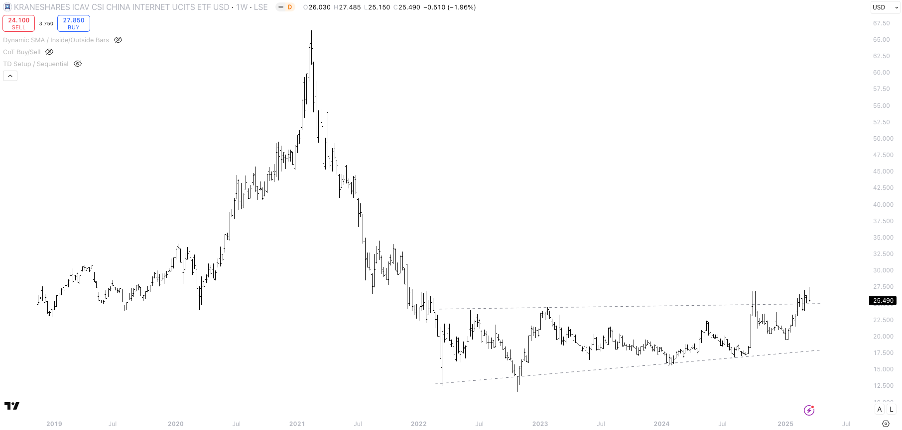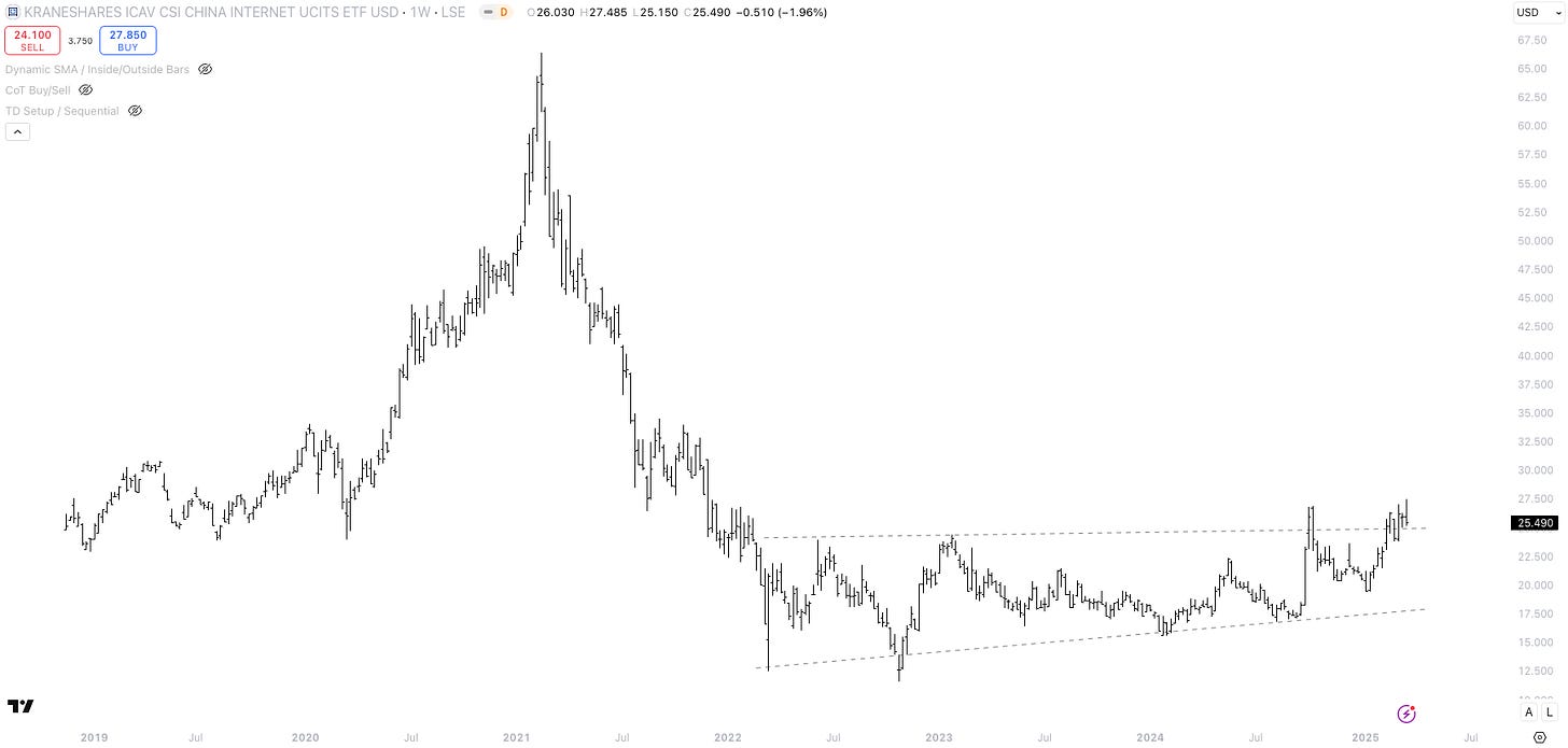 Idea 2 - Long KWEB: Another idea I am currently thinking about is the Chinese tech sector (KWEB). After a one-year brutal bear market in 2021, three years of sideways action, the Chinese tech sector could be poised for a recovery. It feels like investor and economic sentiment around China is slowly improving. On the weekend, I read that some Chinese banks are offering consumer loans at 2.6% with approval times of below 60 seconds. That will certainly boost Chinese consumption, don’t you think?