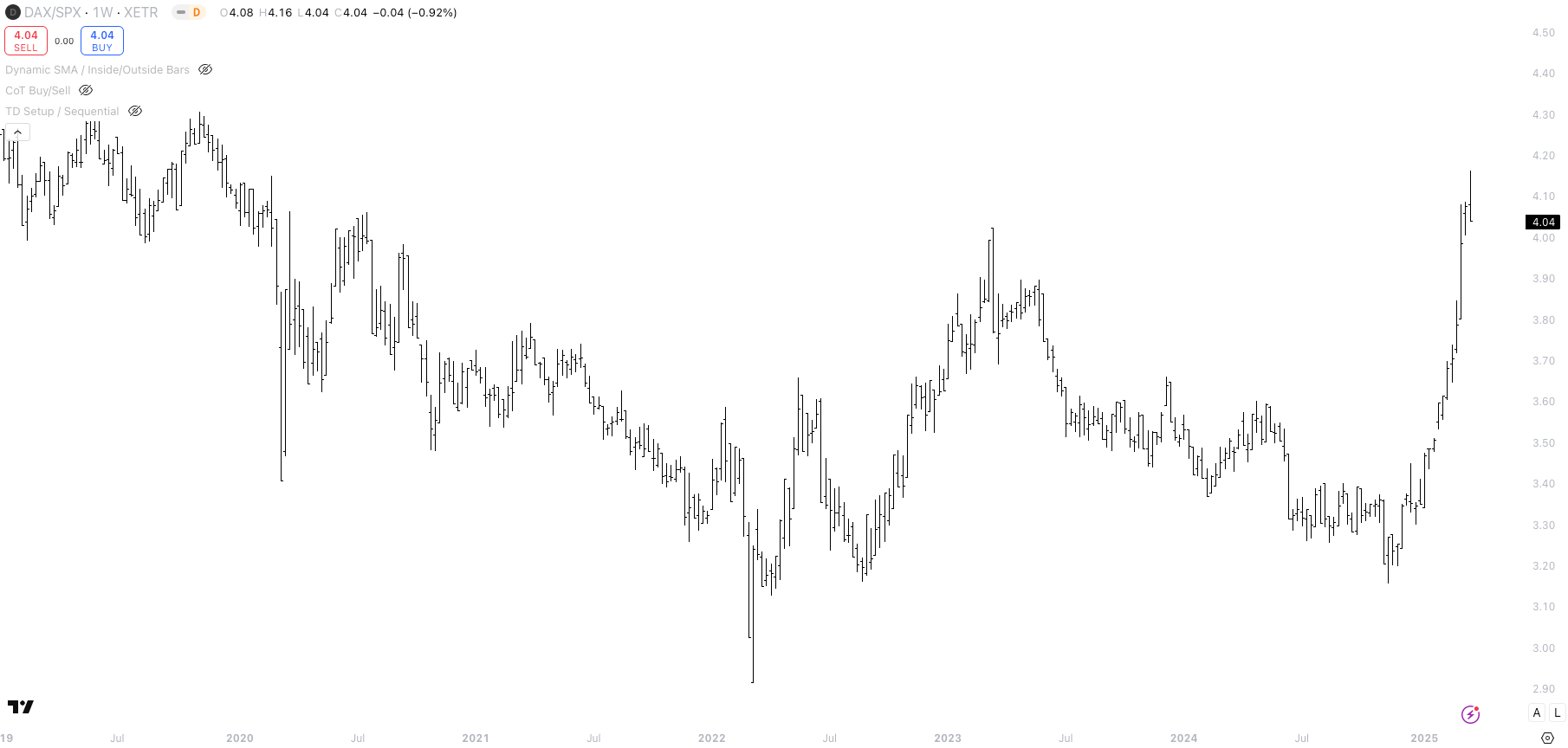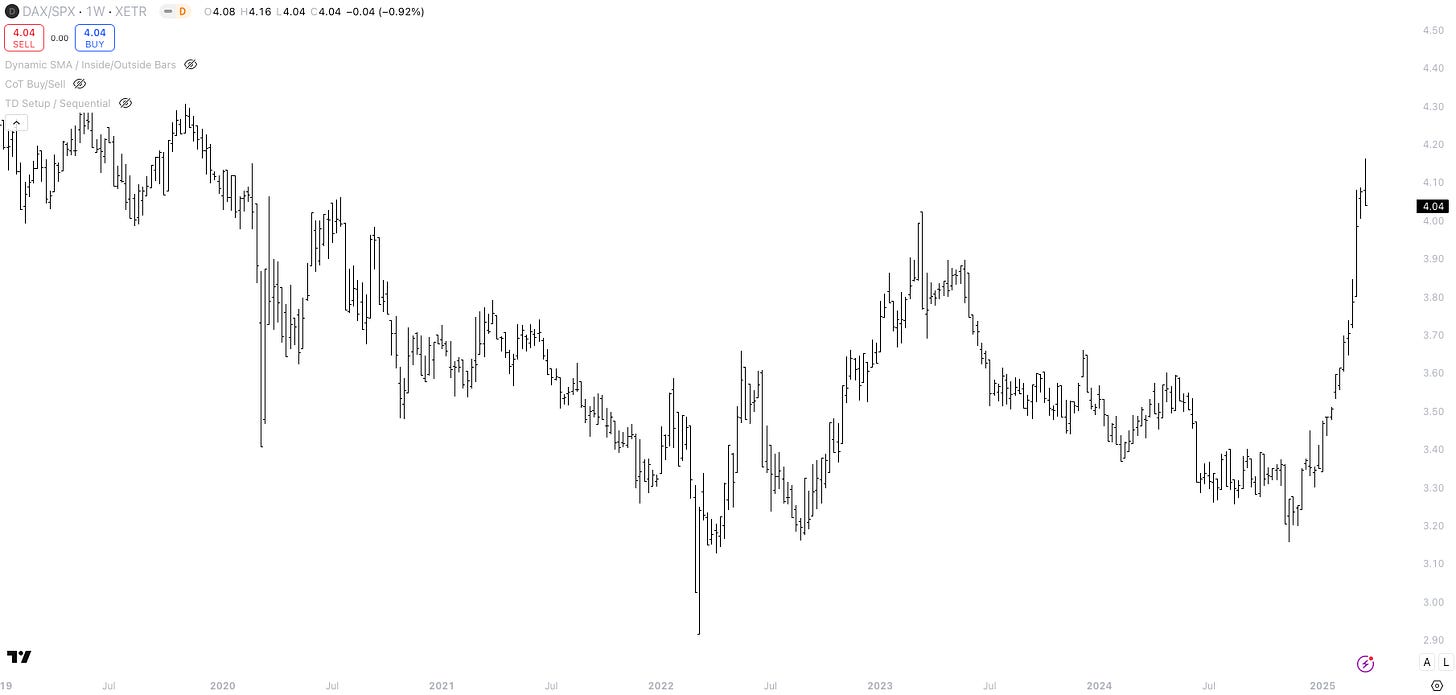 Idea 4 - Long US vs. European equities: And lastly, did you realise that the DAX was down 0.41% this week although the German fiscal package was approved? This could be a classic “buy the rumour, sell the news” event. The macro consensus seems to expect that Europe will continue to outperform the US. And yes, we could see better performance from European equity markets, but the structural problems in Europe have not been solved. Is it time to bet on the US outperforming Europe again? The below chart displays the DAX divided by the S&P 500.